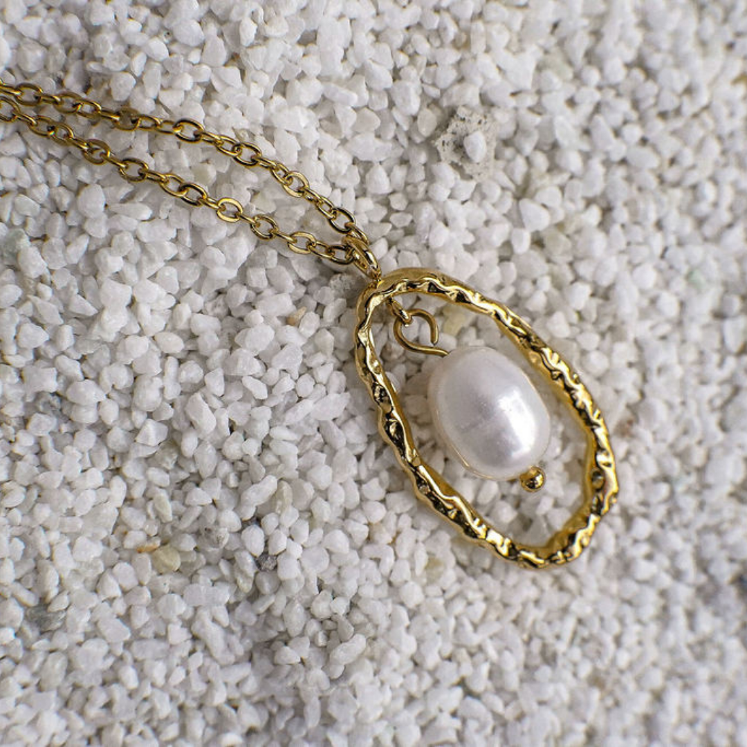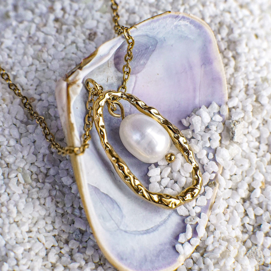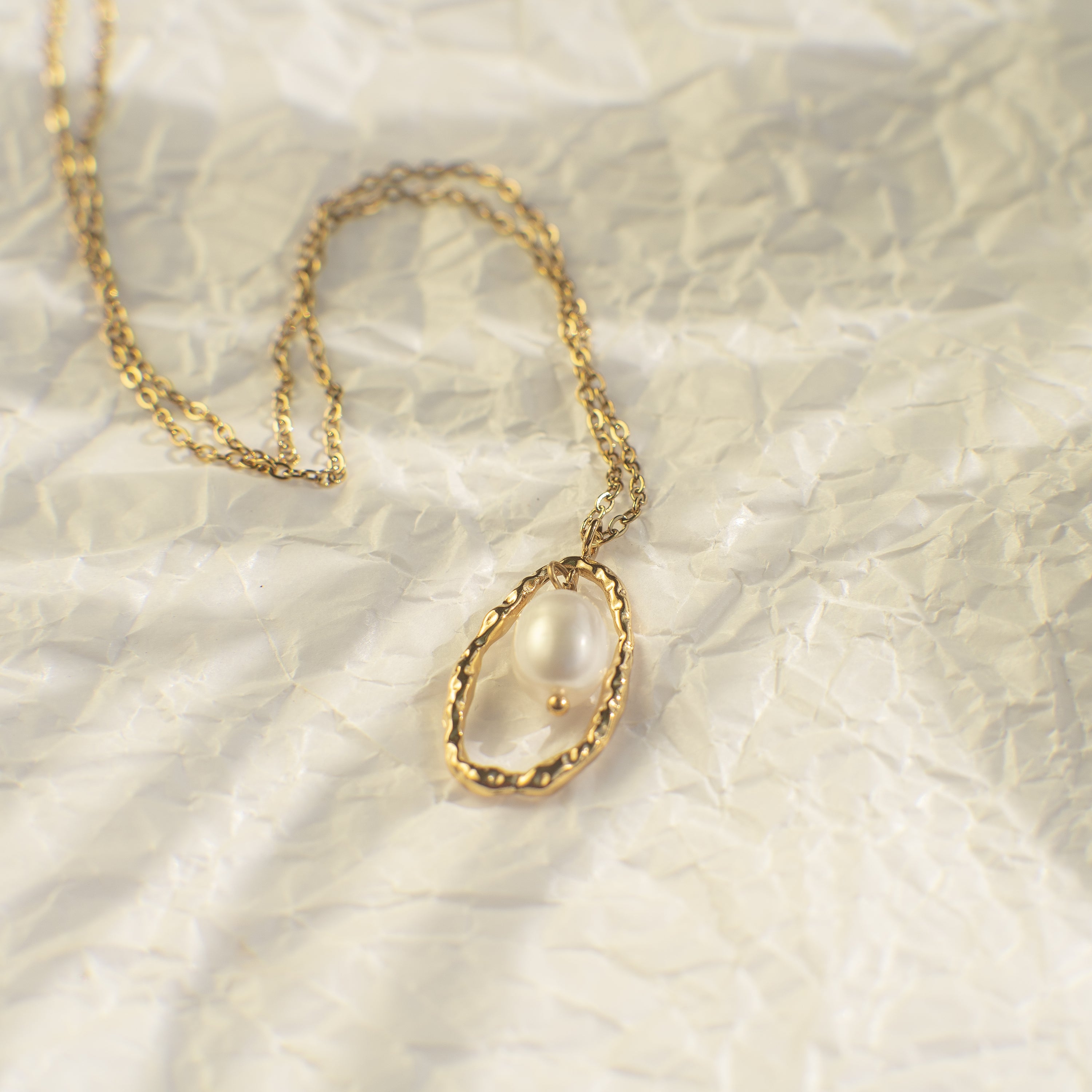 Deyanira pairs a luminous freshwater pearl with a sculpted, hammered oval frame — a striking balance of organic beauty and refined artistry. Bold yet graceful, this pendant brings texture, radiance, and timeless allure to any look.