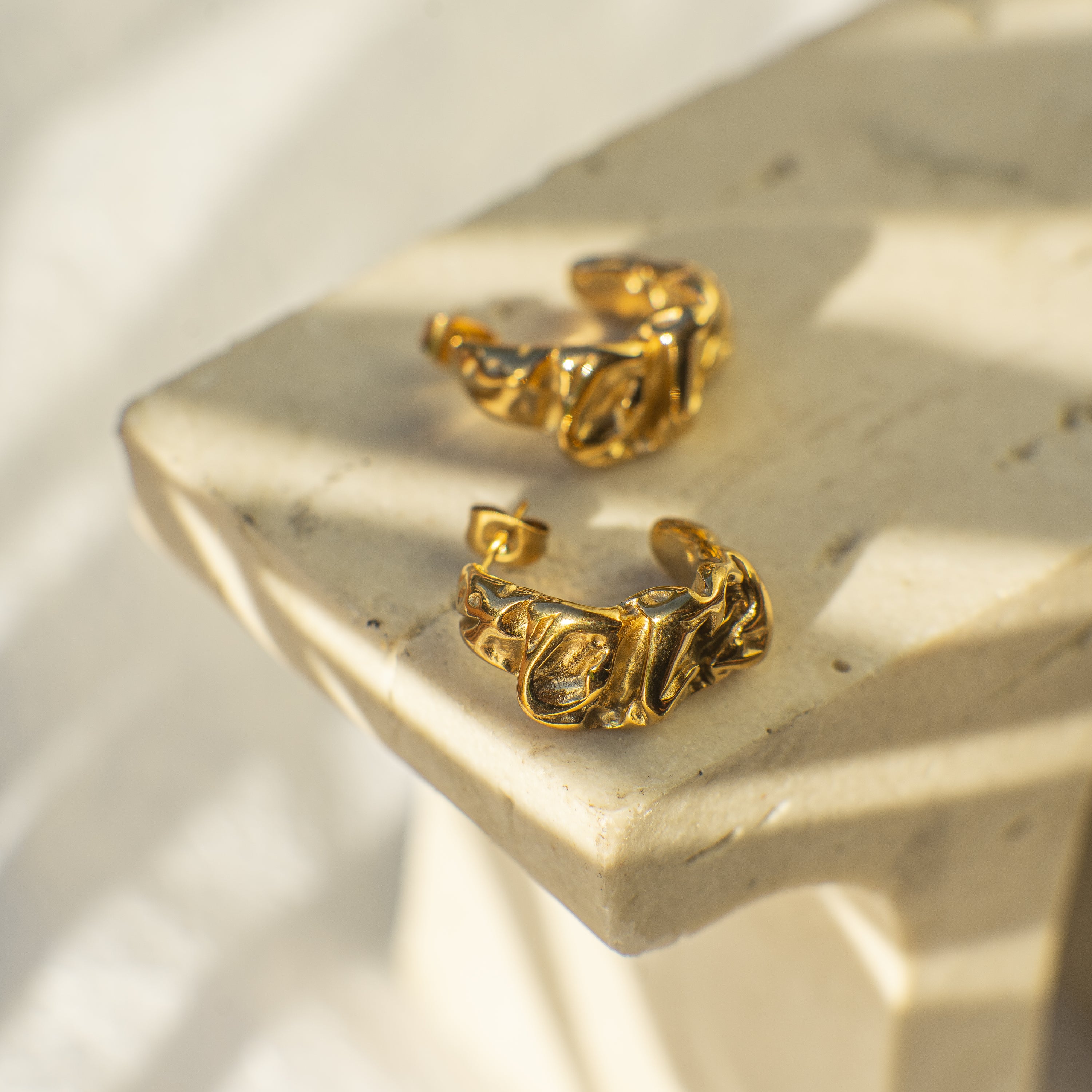The Dzintra earrings dance between structure and freedom, with abstract gold hoops that catch the light like liquid art. Designed to celebrate individuality and movement.