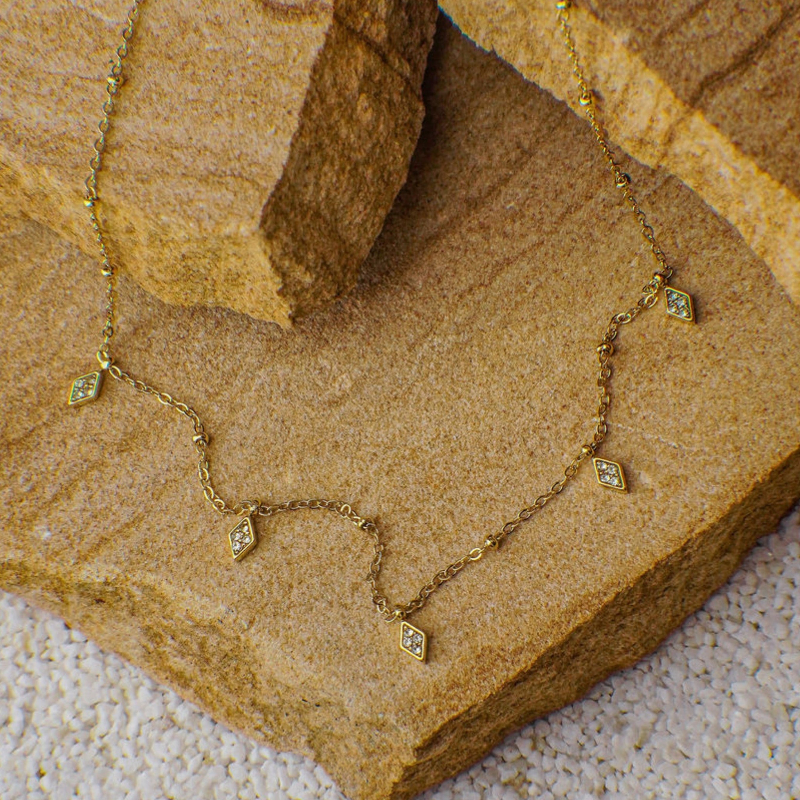 Elegant yet easygoing, the Elandra necklace features delicate rhombus charms inlaid with sparkling crystal accents. Set on a dainty gold-toned chain, it adds a soft shimmer and touch of charm to your everyday layering look.