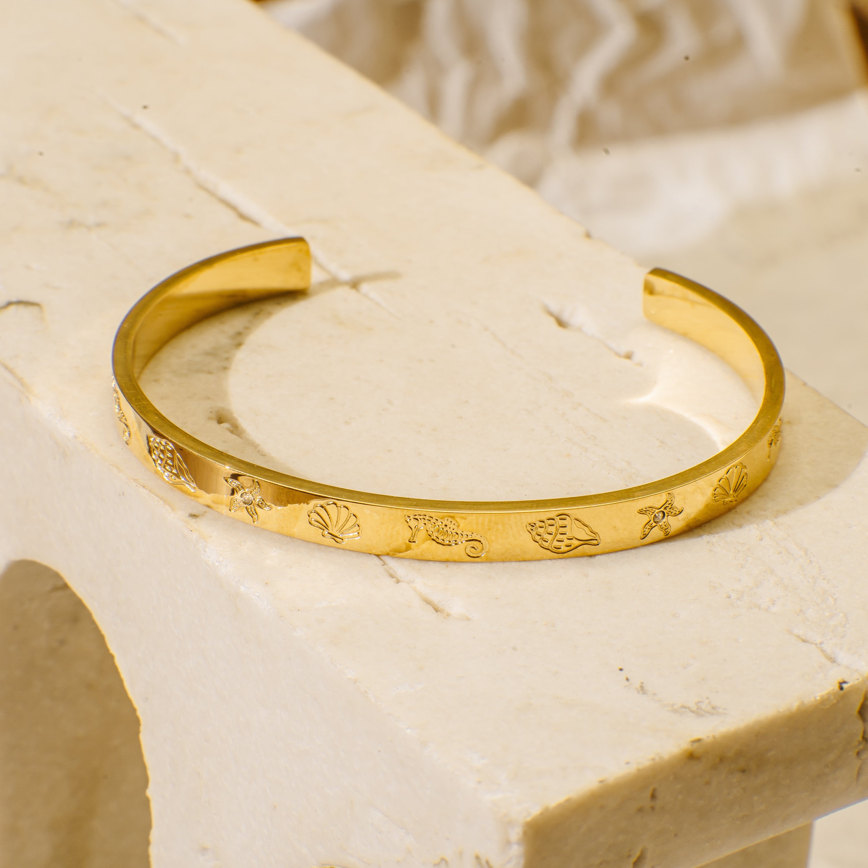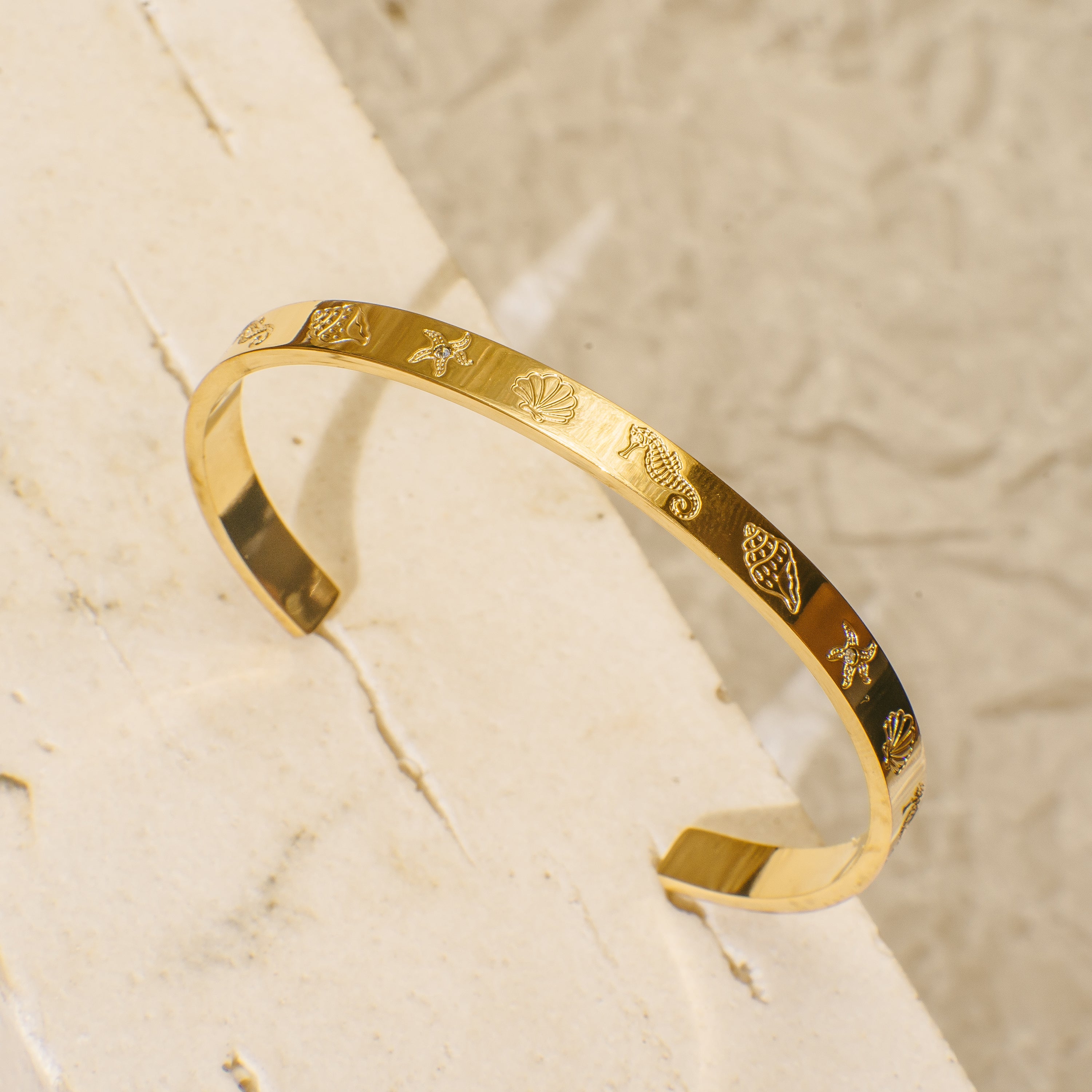 Celebrate the beauty of the ocean with the Marite gold bangle, featuring delicate engravings of sea creatures. Its elegant design adds a touch of charm to any outfit.