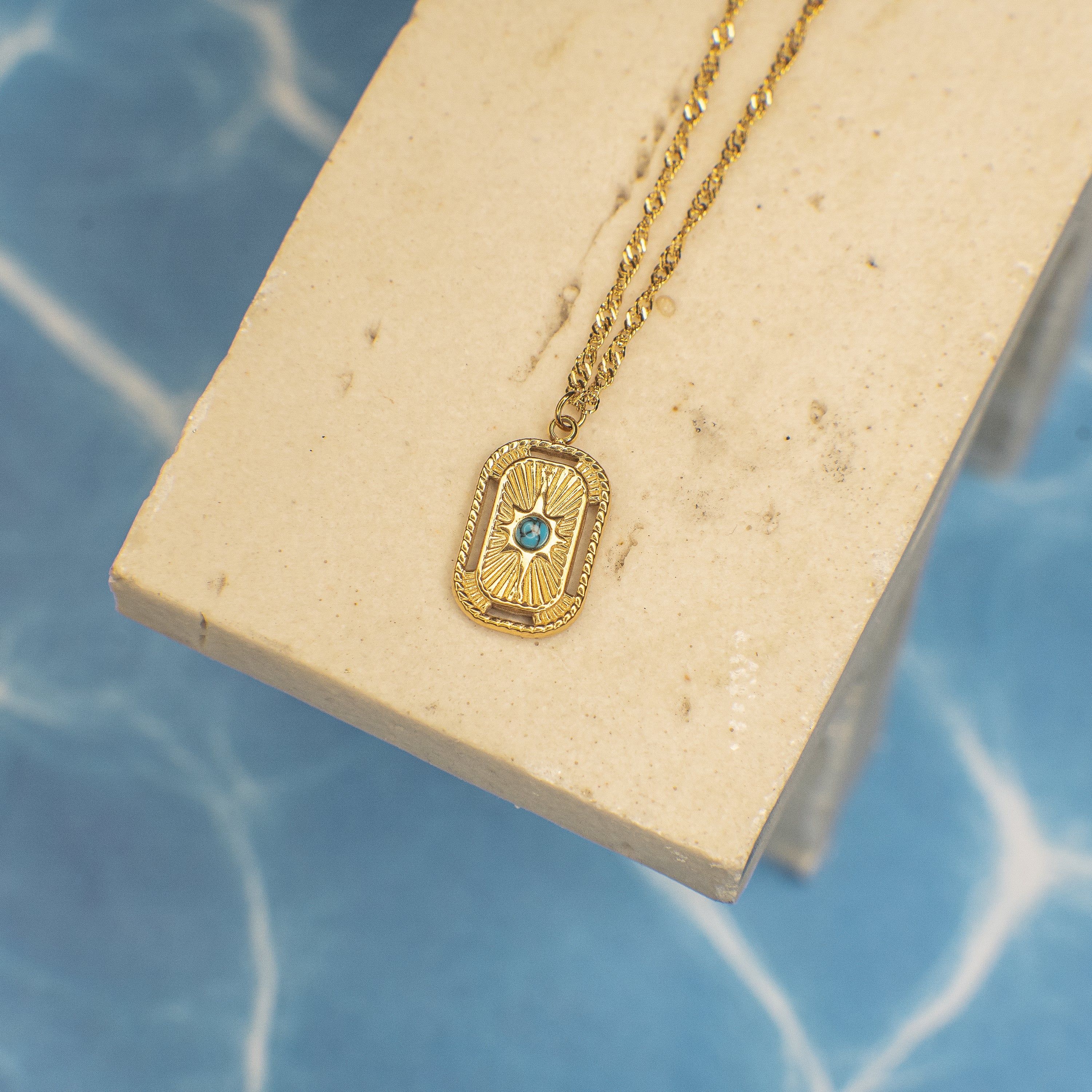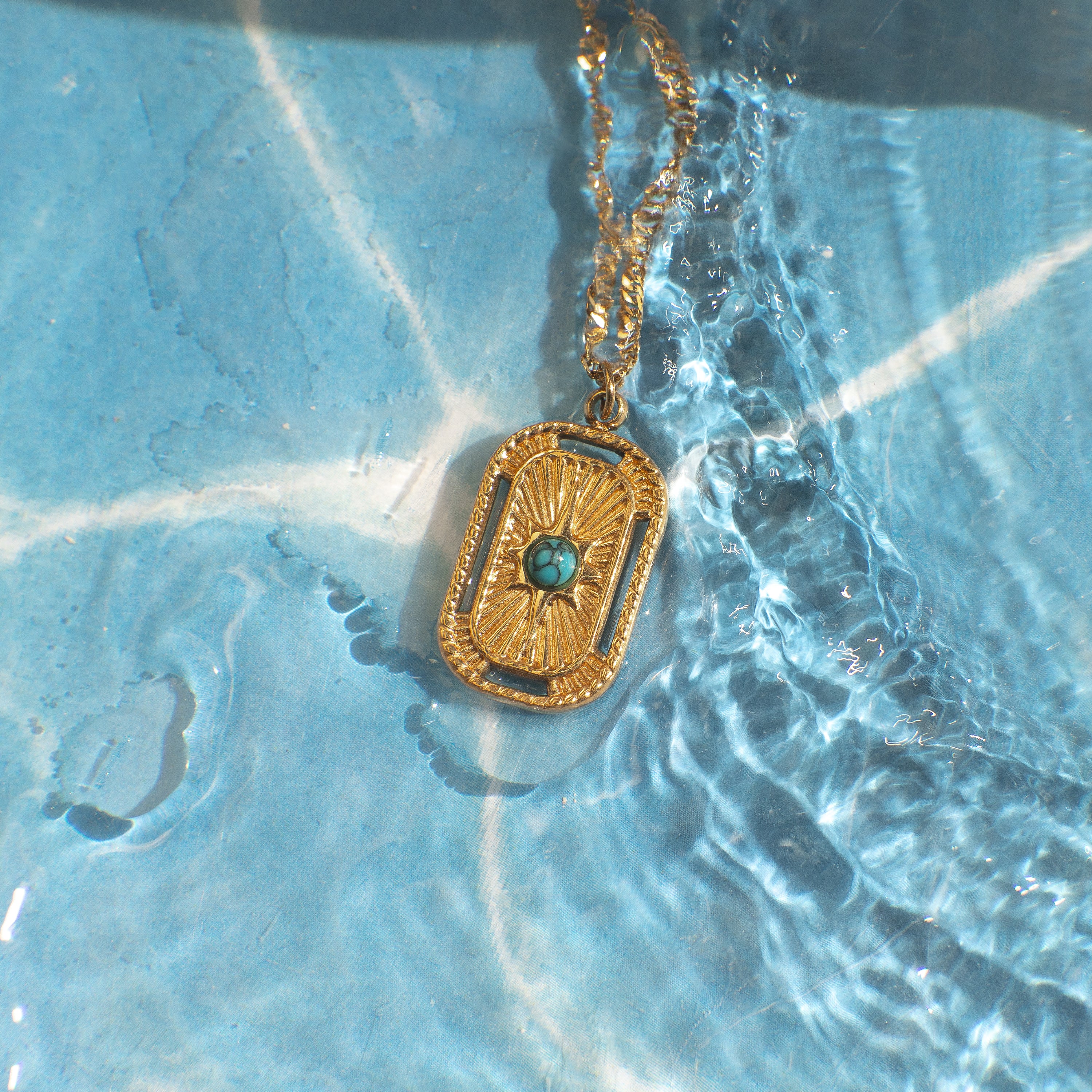 A radiant ode to celestial energy, the Nyx necklace showcases a sunburst medallion crowned with a vibrant turquoise stone. Encircled by a bold, textured border, it balances strength with serenity — a timeless piece for effortless daily wear or layered, luminous statements.