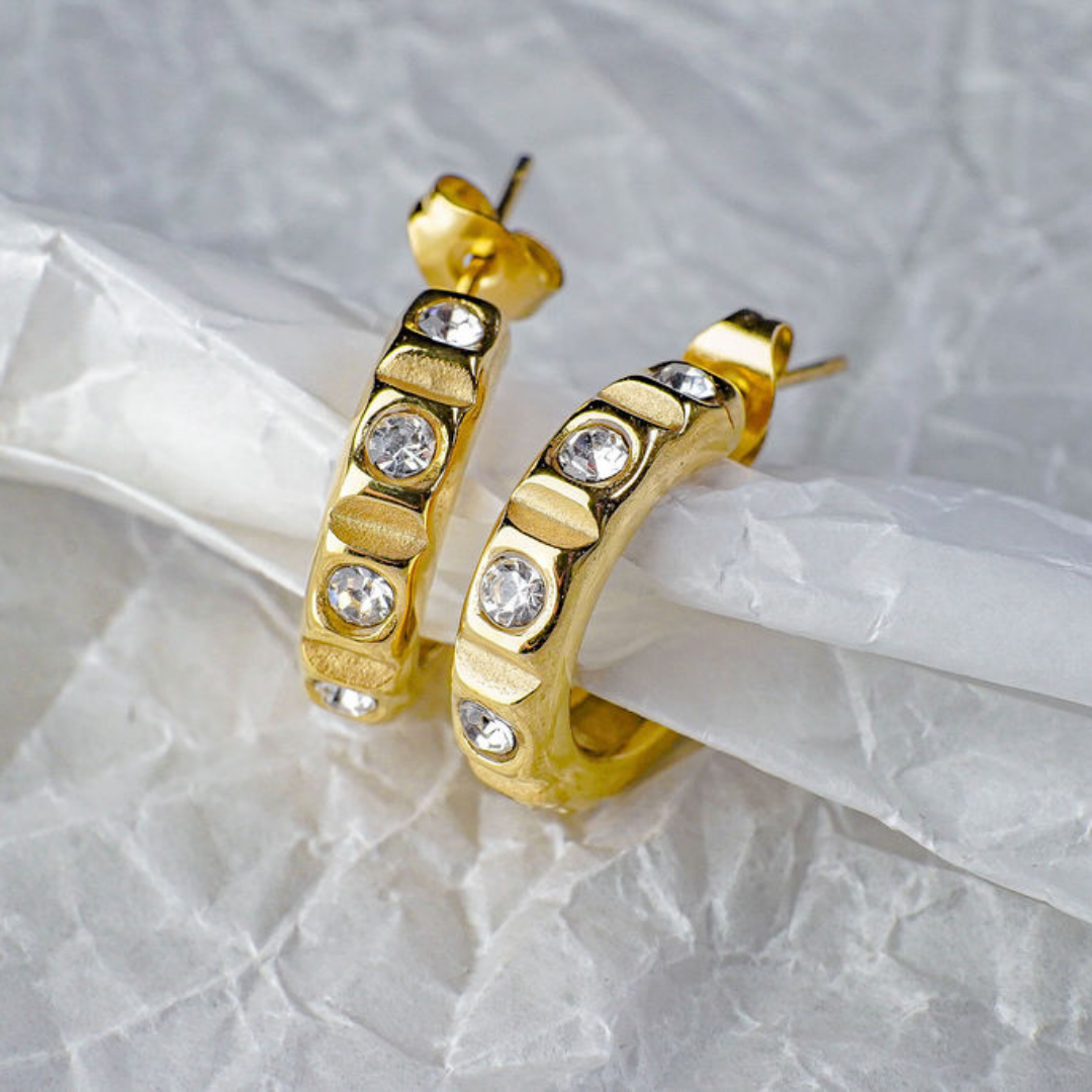 Add a touch of sparkle to your everyday with Priya, bold gold hoops set with gleaming gems, spaced perfectly for subtle shine. The ridged design adds texture and depth, making them a standout from day to night.