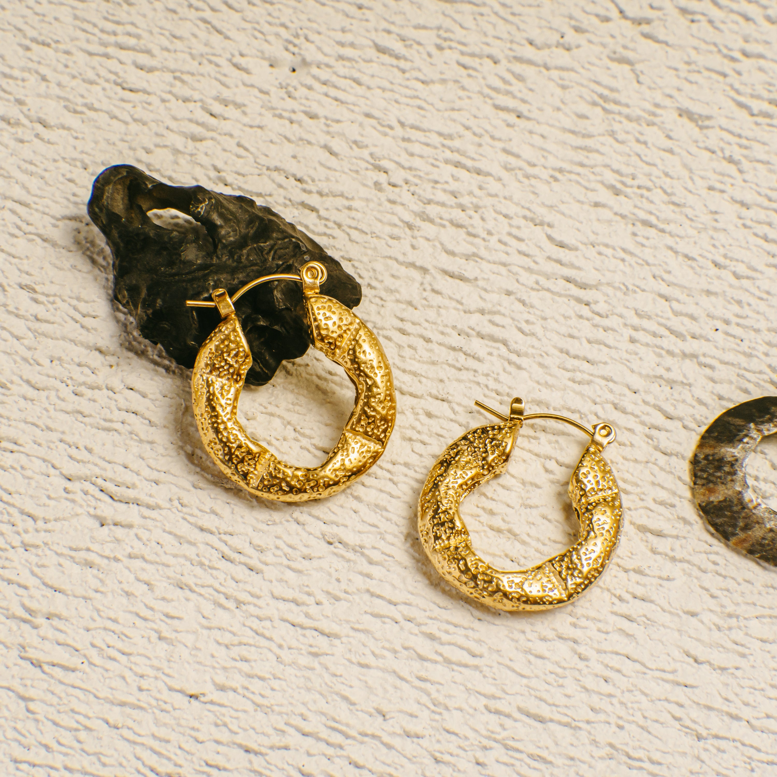 Make a subtle statement with the Ruxandra Crumpled Hoop Earrings. The unique crumpled texture adds depth and character to these sleek hoops, catching the light with every movement.