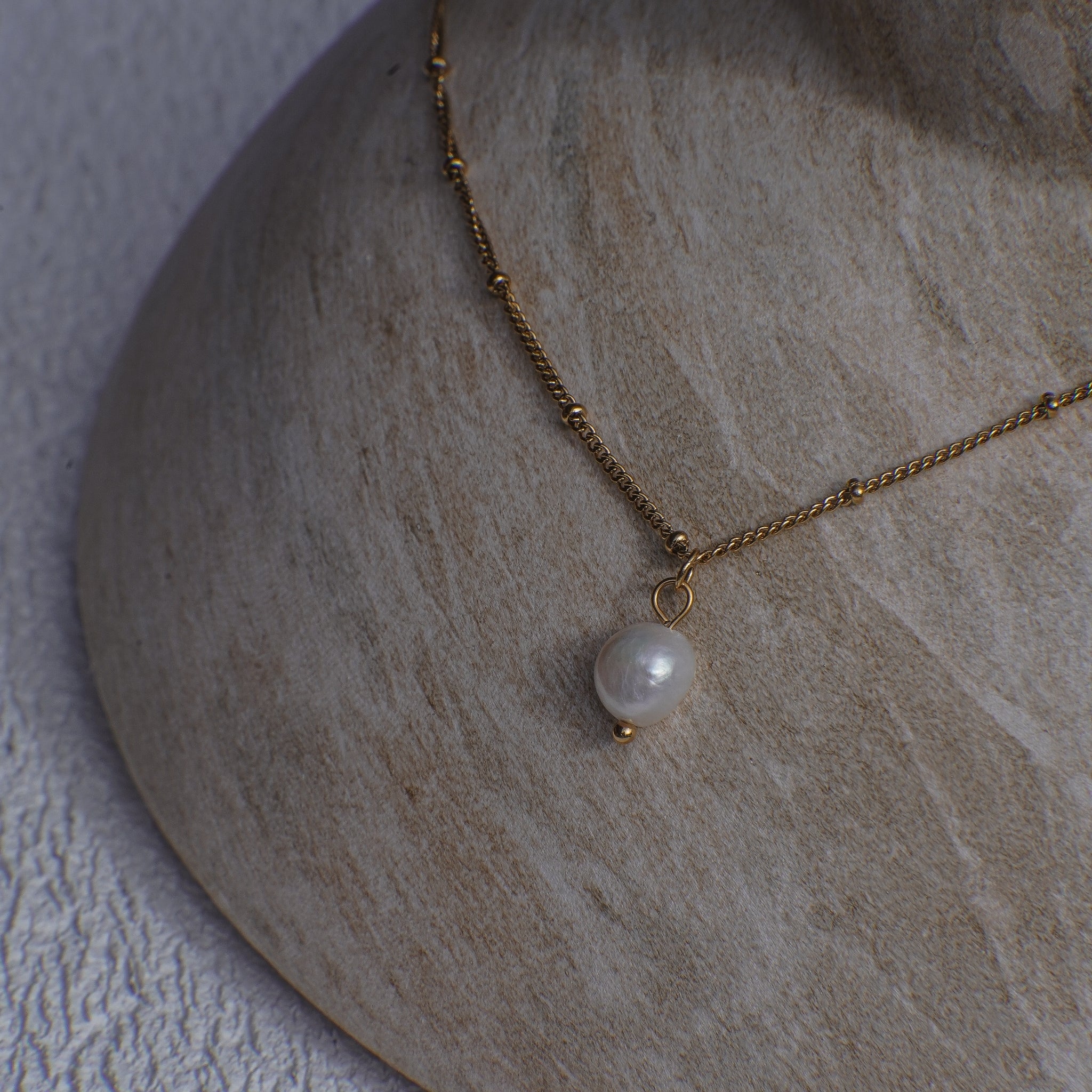 Soley is a delicate bead-chain necklace that spotlights a single baroque pearl — imperfect, organic, and one-of-a-kind. With its soft gold tone and subtle shimmer, it’s the kind of piece that feels personal and effortlessly graceful.