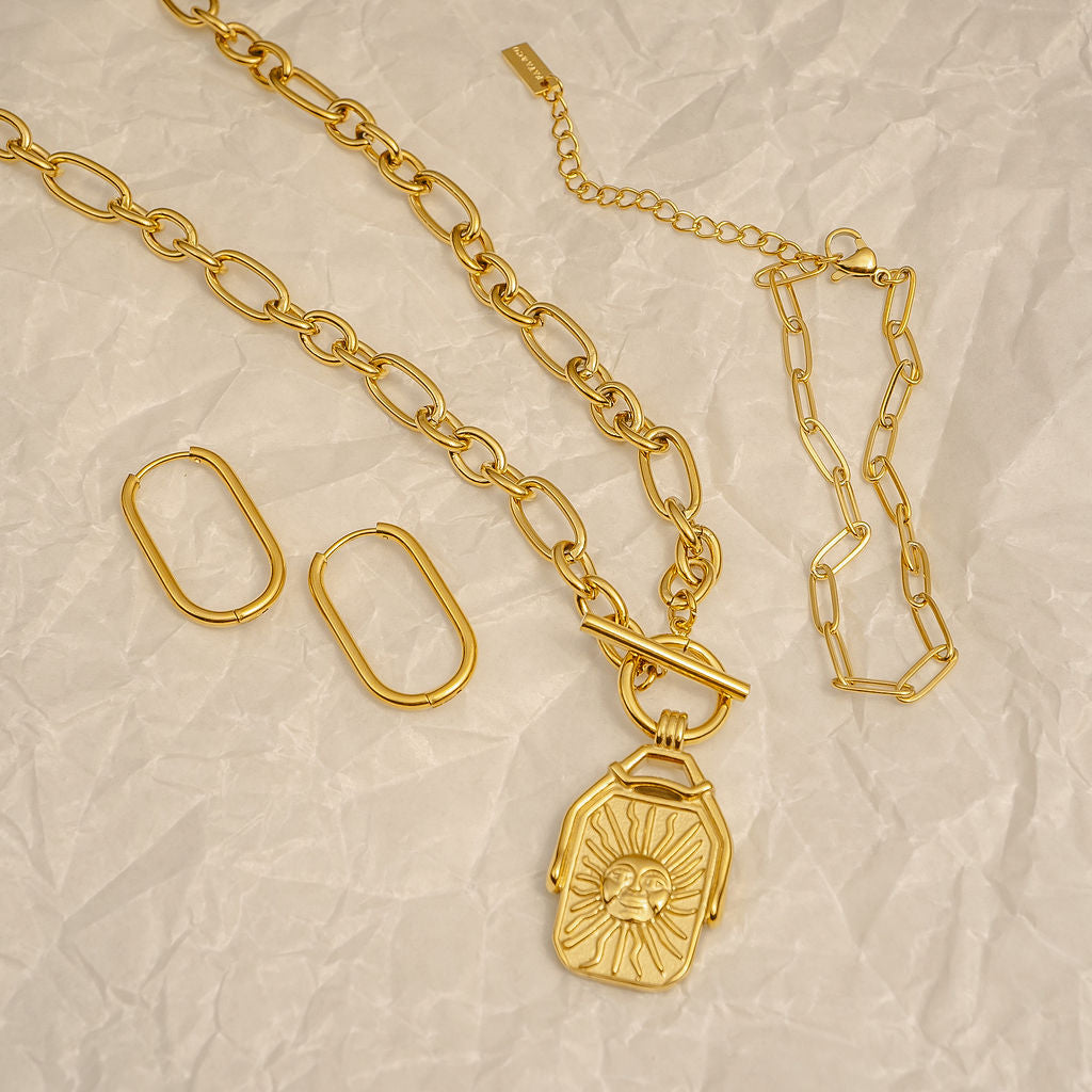 The Blazing Sun Set radiates confidence and golden warmth. Featuring a striking sun pendant necklace, sleek U-shaped huggie earrings, and a bold oblong chain bracelet, this set captures the brilliance of summer light.