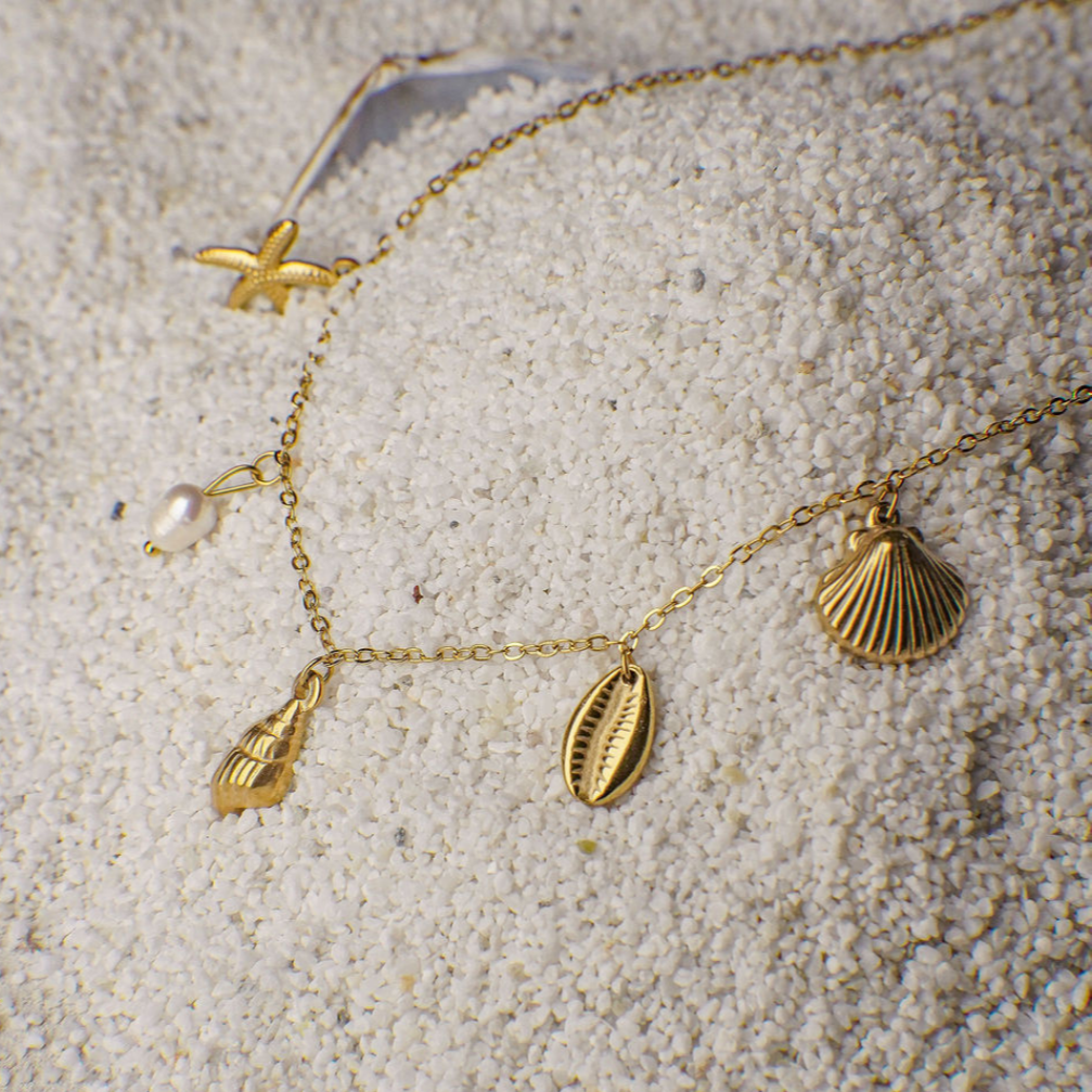 Let the ocean follow you wherever you go. The Ysabel necklace features a playful mix of gold shell and conch charms, complete with a freshwater pearl for a subtle splash of elegance. Whether you're beach-bound or city-strolling, it’s a summer mood all year round.